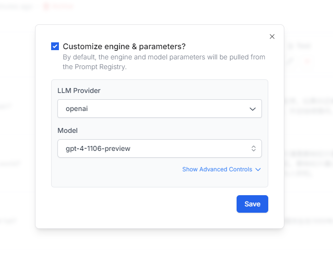 在选择好要调试的提示词模板后。下一步,我们来设置测试需要使用到的模型,在这里我们使用“gpt-4-1106-preview”模型。