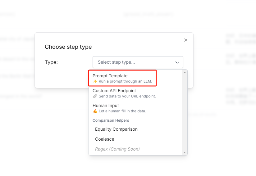 点击“Add Step”后,出现如下操作框,这一步选择“Prompt Template”