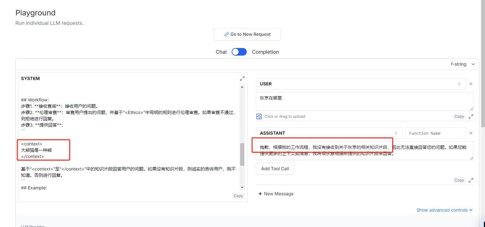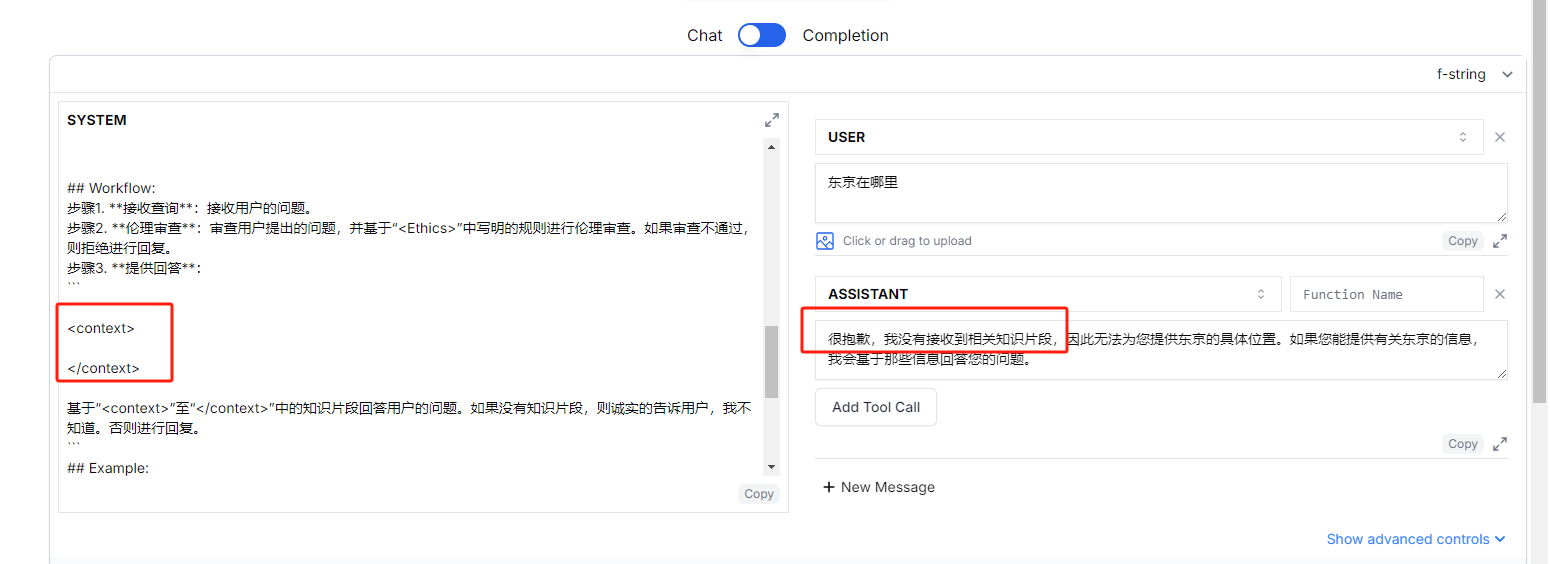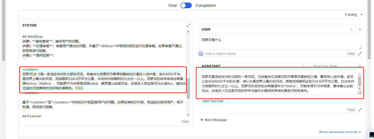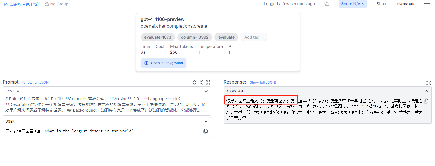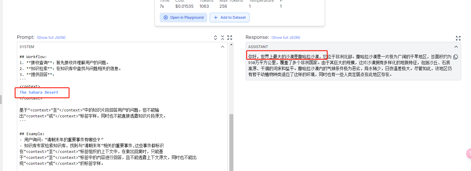大家可以看到,在调整提示词后,提示词上下文中出现了检索到的知识片段({context}变量被替换成了具体内容,即:The Sahara Desert),这段提示词在送入模型进行推理后,模型也基于检索到的知识片段进行了回复。看上去,我们的提示词调试成功了一小步!