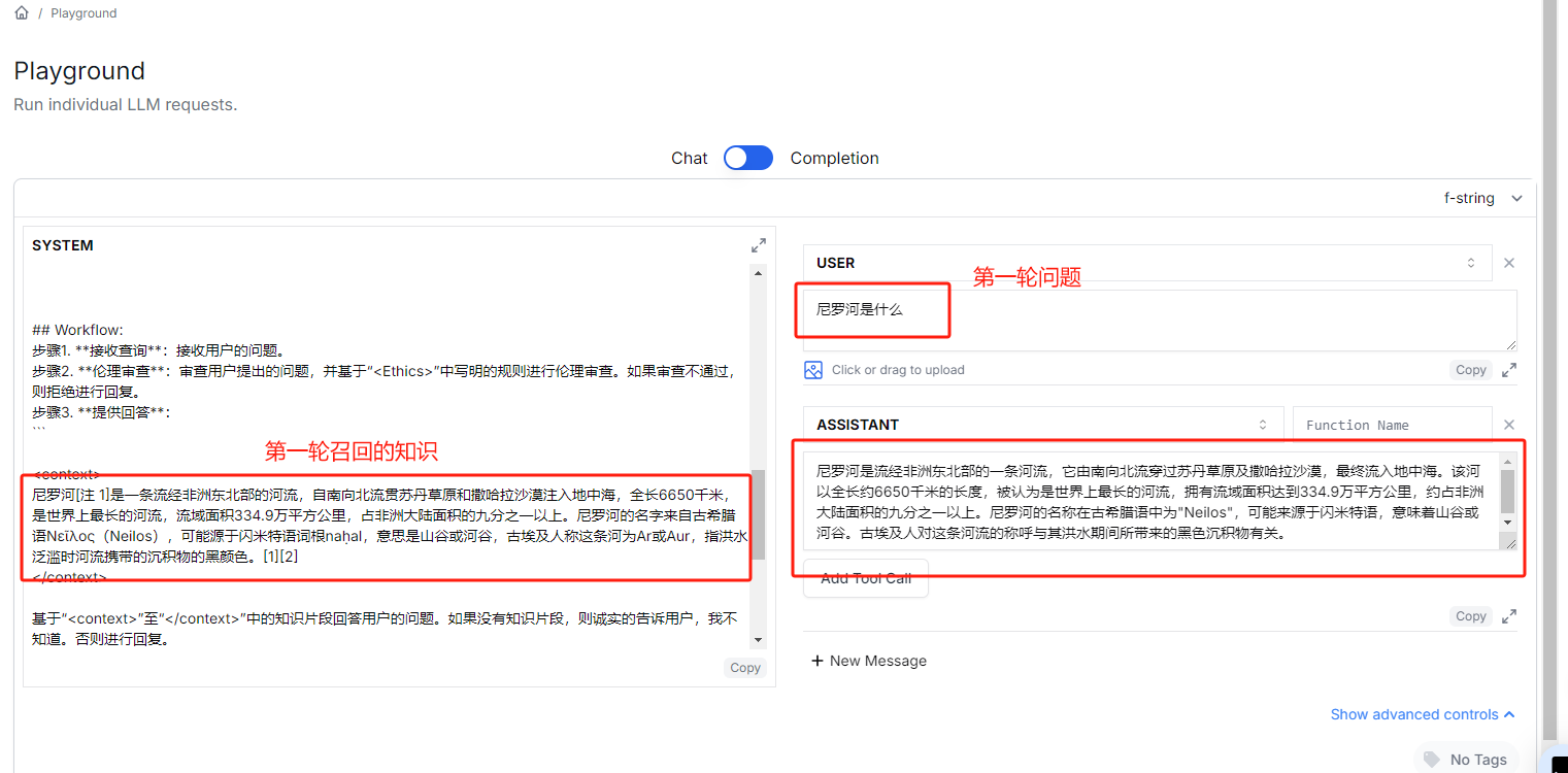 在第一轮对话中,我们提出问题”尼罗河是什么?“,接着,系统成功召回了关于“尼罗河“的知识片段,并做出了回复。