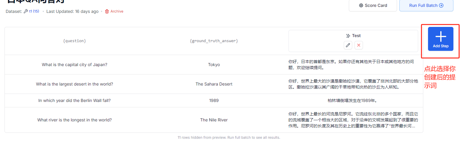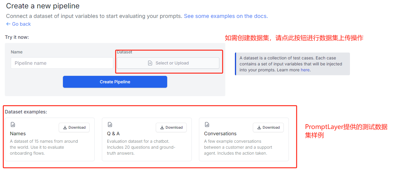 在这一步中,你可以上传自己的测试数据集,也可以使用PromptLayer提供的测试数据集,目前PromptLayer支持的数据集格式有Json和CSV两种。