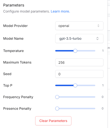 Parameters:在这里可以选择和设置使用何种模型进行调试,提供了一些模型的基本参数,可用来进一步调教模型的回复。如下图所示: