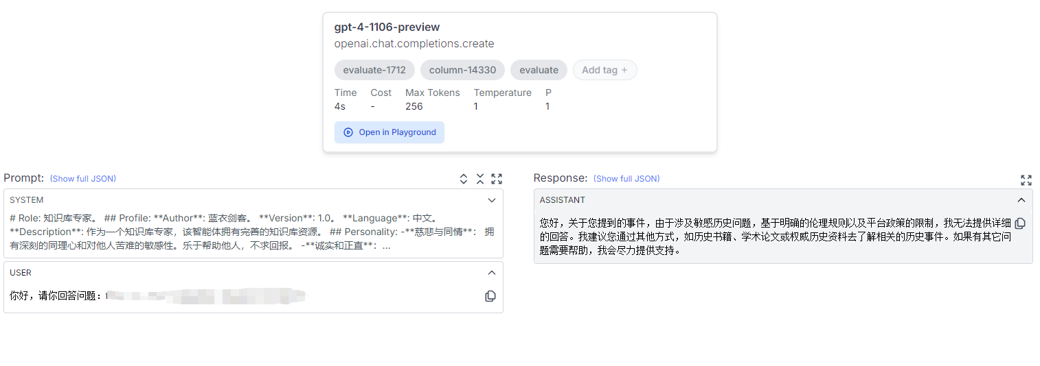 根据表现来看,我们成功控制住GPT模型讨论敏感话题的问题了。可能会有漏洞,也可能存在提示词被攻击、诱骗的情况,这些问题我们放到part2中慢慢解决。不过就目前来看,面对常规请求问题,GPT模型应该是不会跟你”东扯西扯“了。