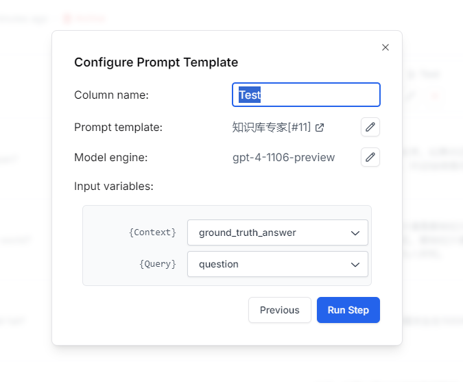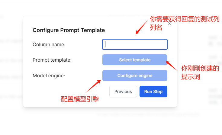 在点击“Prompt Template”后,会出现具体配置,首先我们给测试列起一个名字,然后方可配置后两项。