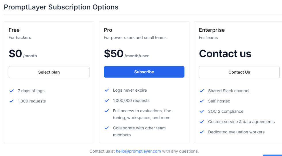 首先我们登录PromptLayer的网站(https://promptlayer.com/create-account),并创建一个账号,新创建的账号默认是Free方案,这个方案有1000次免费请求,足够测试使用。