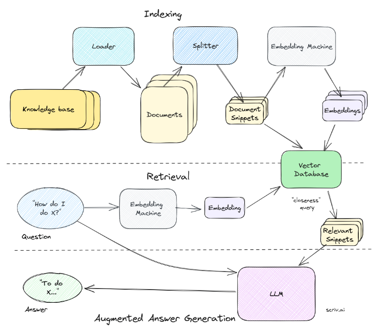 我们从下面 SCRIV.AI 提出的ChatBot 解决方案作为示例,先介绍 RAG架构的工作步骤,然后说明提示工程的作用。
