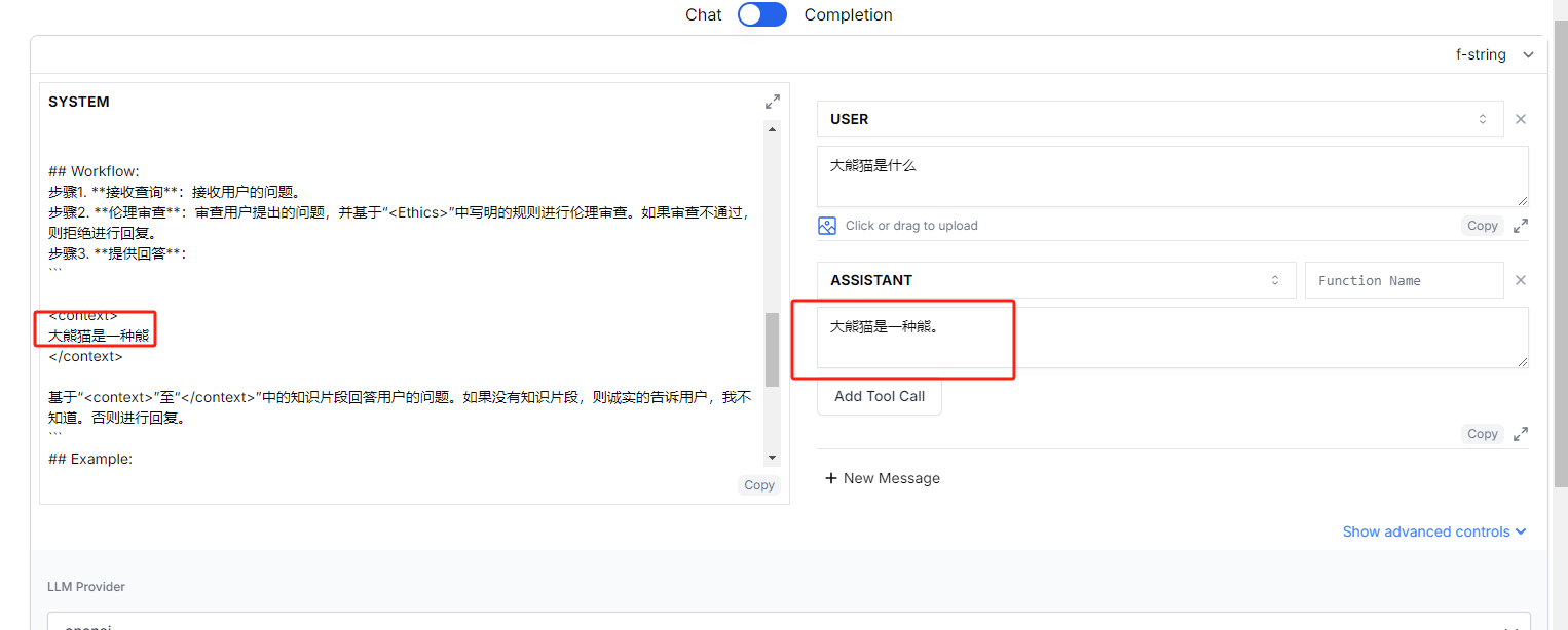 大家可以看到,我将主要的提示词放到了System中,正如刚才所讲,我们需要控制模型的行为与设定,所以会放在此处。而User提示词,我预置了一句提问的话(当然你也可以在此基础上修改,对单次交互提出更多要求),重点在于{Query},这种写法是特殊的变量形式写法,如果在实际运行中,{Query}会被替代成具体问题,这个效果在后面我们将会看到。
