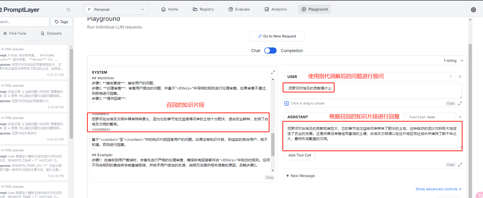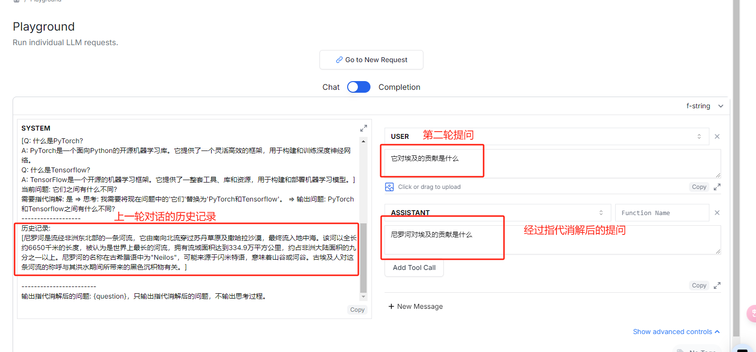 首先我们需要把提示词更换为处理”指代消解“的专用提示词,紧接着,我们尝试提问“它对埃及的贡献是什么?”